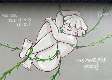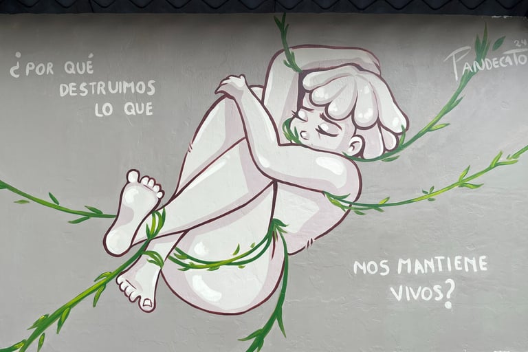 Mural colaborativo con el Municipio de Pastaza y la Casa de la Cultura, una reflexión visual sobre la fragilidad del vínculo entre humanidad y naturaleza.